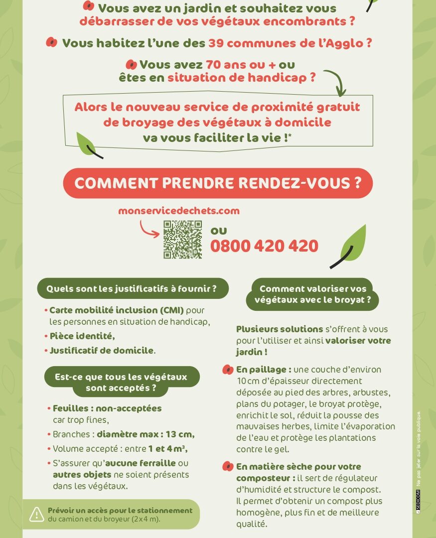 Pour faciliter l’organisation et assurer le meilleur service possible à tous les habitants, le rendez-vous est limité à 4 m3 de végétaux à broyer (les feuilles, tontes et palmiers ne sont pas acceptés). Le broyage est assuré par des agents de SUEZ et/ou OCEAN, prestataire de Nîmes Métropole, nous comptons sur votre coopération et votre bienveillance envers les agents.
