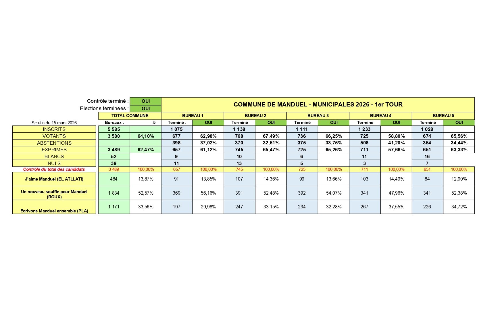 Résultats des élections municipales du 15 mars 2026.