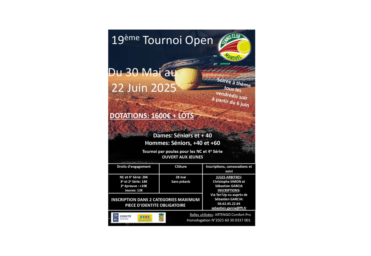 Evènements Retour aux événements 19ème Tournoi Open – Du 30 mai au 22 juin 2025Du 30/05/2025 au 22/06/2025 + Ajouter au calendrierRécapitulatif Date et heureDu 30/05/2025 au 22/06/2025Lieu 30129 Manduel Pour afficher ce contenuvous devez accepter les cookies Publicitaires.Comment s'y rendre Partager Le lien à bien été copié