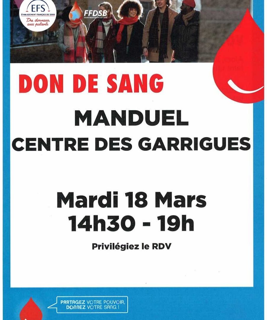 Evènements Retour aux événements Don du sangLe 18/03/2025 de 14h30 à 19h00 + Ajouter au calendrierRécapitulatif Date et heureLe 18/03/2025 de 14h30 à 19h00Lieu Salle des Garrigues Cours Jean Jaurès 30129 Manduel Pour afficher ce contenuvous devez accepter les cookies Publicitaires.Comment s'y rendre Partager Le lien à bien été copié