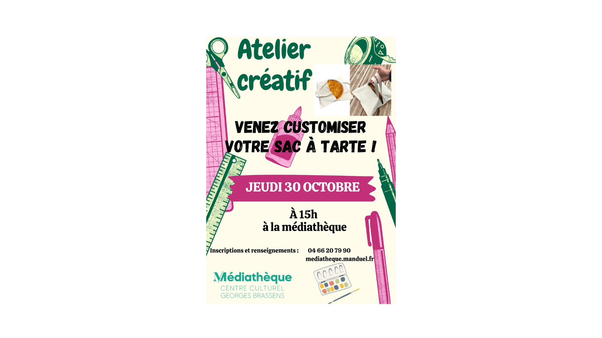 Retour aux événements Atelier créatif 30 octobre 2025Le 30/10/2025 à partir de 15h00 + Ajouter au calendrierRécapitulatif Date et heureLe 30/10/2025 à partir de 15h00Lieu 21 Rue Colbert 30129 Manduel Pour afficher ce contenuvous devez accepter les cookies Publicitaires.Comment s'y rendre Partager Le lien à bien été copié