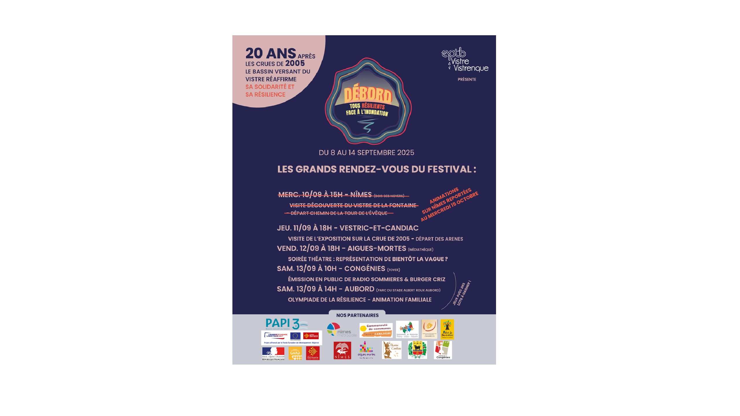 Evènements Retour aux événements Festival DEBORD – Report de la journée du mercredi 10 septembreDu 10/09/2025 au 15/10/2025 + Ajouter au calendrierRécapitulatif Date et heureDu 10/09/2025 au 15/10/2025 Partager Le lien à bien été copié