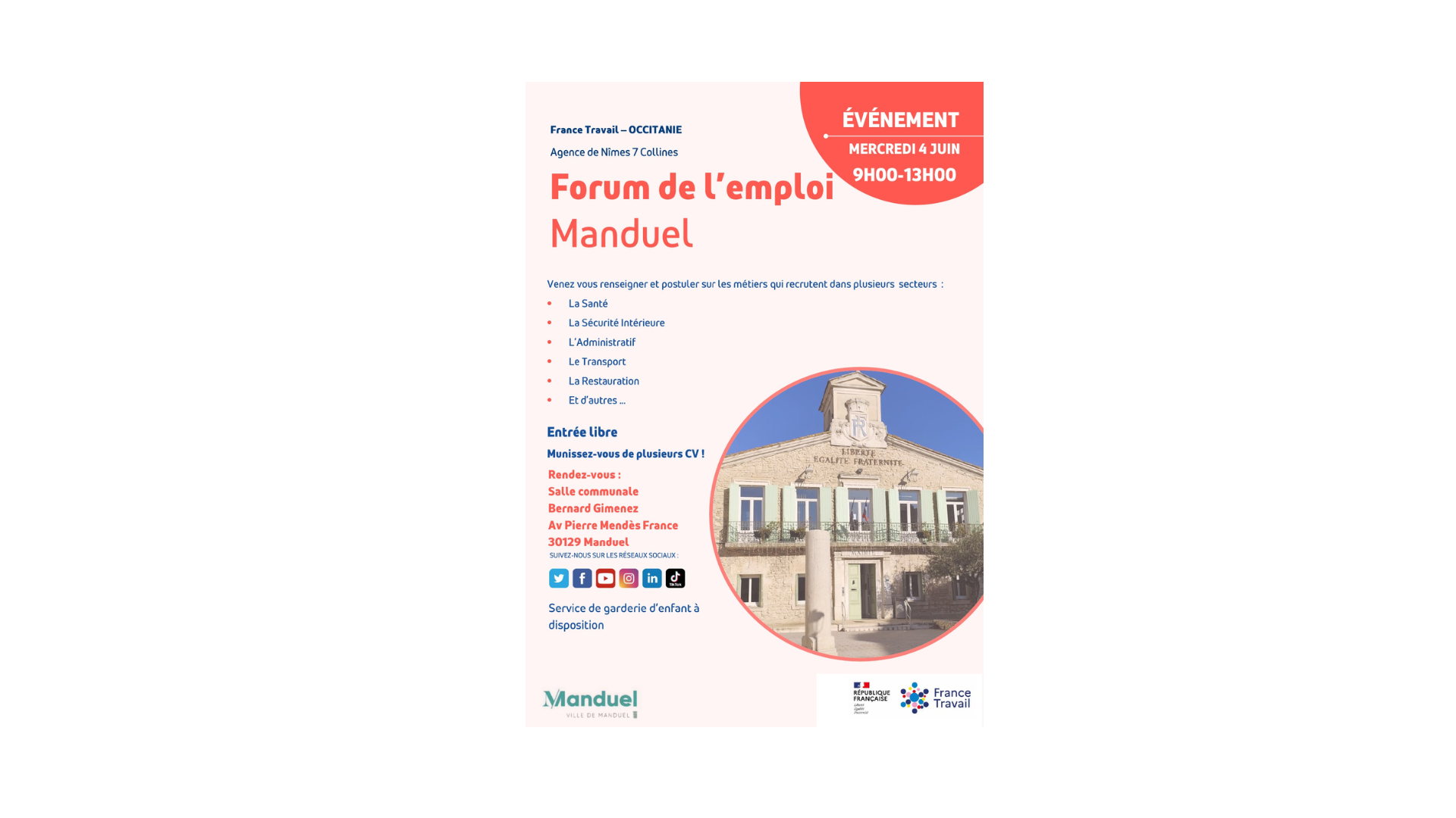 Evènements Retour aux événements Forum de l’emploi 04 juin 2025Le 04/06/2025 + Ajouter au calendrierRécapitulatif Date et heureLe 04/06/2025Site Web https://manduel.fr/actualites/forum-de-lemploi-04-juin-2025/ Partager Le lien à bien été copié