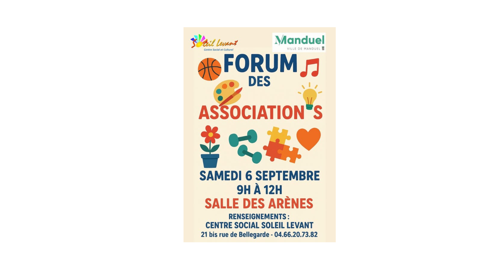 Retour aux événements Forum des associations 06-09-2025Le 06/09/2025 + Ajouter au calendrierRécapitulatif Date et heureLe 06/09/2025Lieu Avenue Pierre Mendès France 30129 Manduel Pour afficher ce contenuvous devez accepter les cookies Publicitaires.Comment s'y rendre Partager Le lien à bien été copié