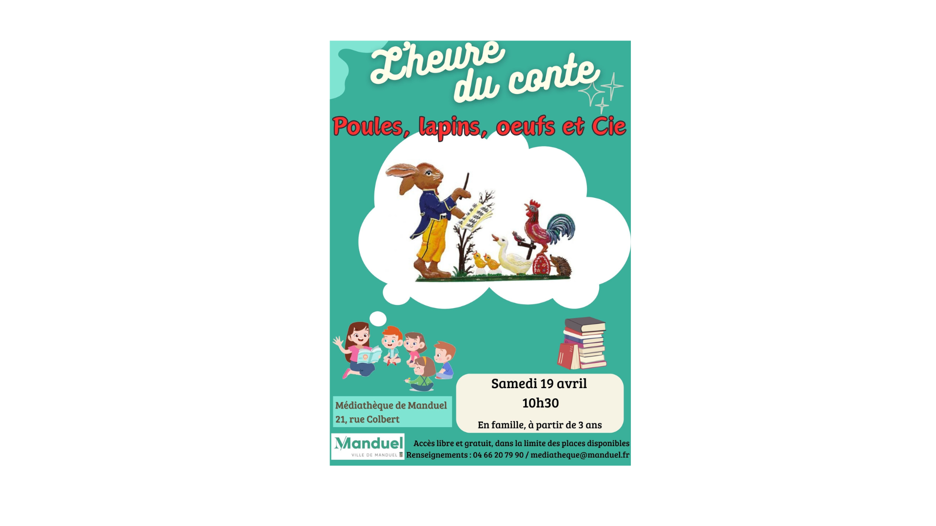 Retour aux événements Heure du conte 19 avril 2025Le 19/04/2025 de 10h30 à 11h00 + Ajouter au calendrierRécapitulatif Date et heureLe 19/04/2025 de 10h30 à 11h00Lieu 21 Rue Colbert 30129 Manduel Pour afficher ce contenuvous devez accepter les cookies Publicitaires.Comment s'y rendre Partager Le lien à bien été copié