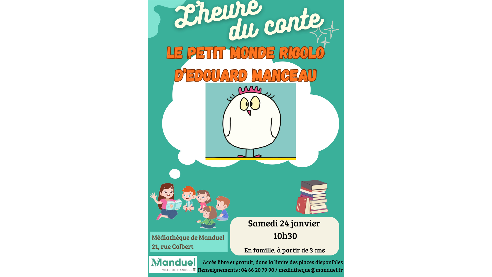 Retour aux événements Heure du conte 24 janvier 2026 Le 24/01/2026 de 10h30 à 11h00 + Ajouter au calendrier Récapitulatif Date et heure Le 24/01/2026 de 10h30 à 11h00 Lieu 21 Rue Colbert 30129 Manduel Pour afficher ce contenuvous devez accepter les cookies Publicitaires. Comment s'y rendre Partager Le lien à bien été copié