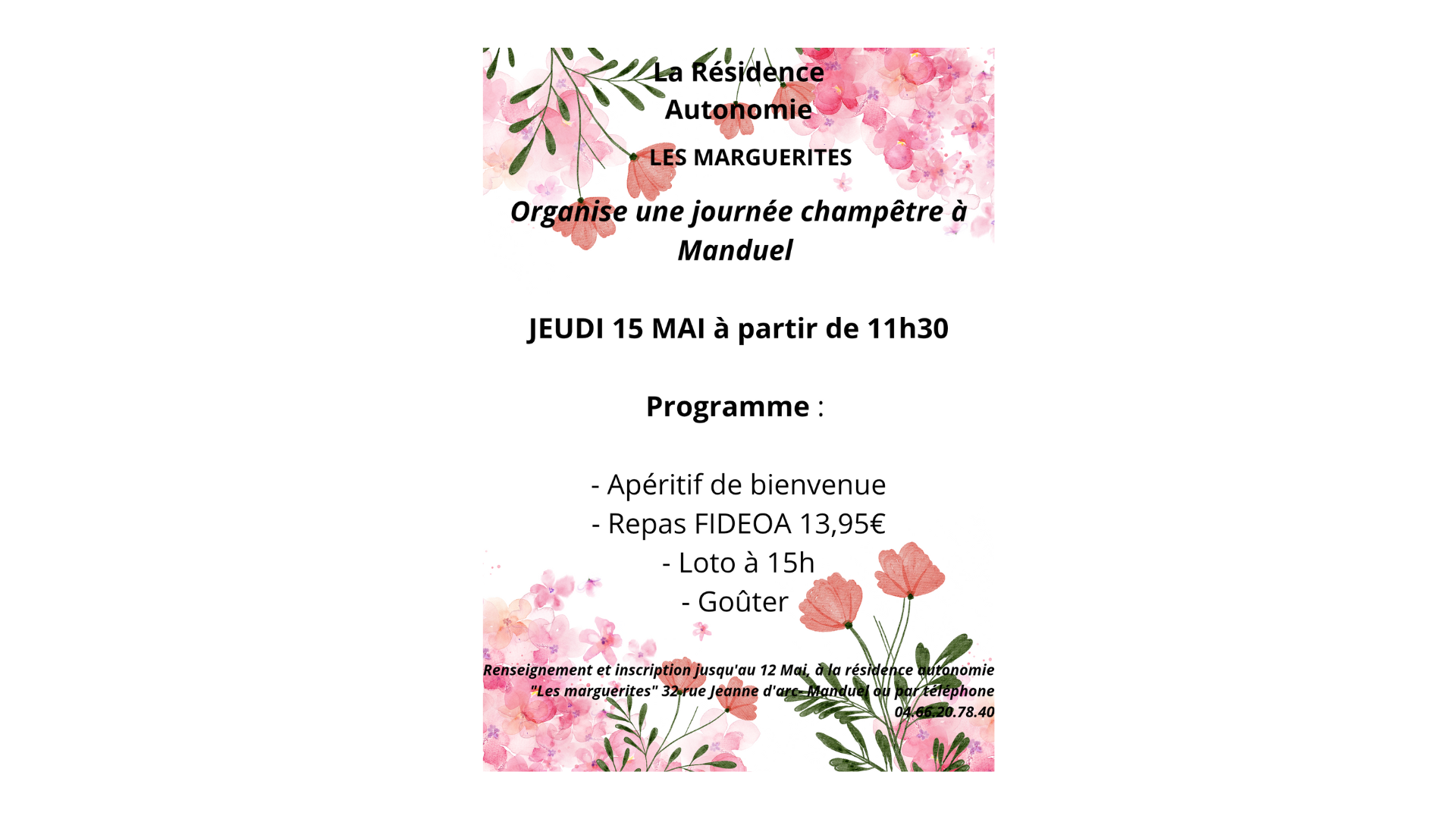 Retour aux événements Journée champêtre résidence autonomie 15 mai 2025Le 15/05/2025 + Ajouter au calendrierRécapitulatif Date et heureLe 15/05/2025Lieu 32 Rue Jeanne d'Arc Prolongée 30129 Manduel Pour afficher ce contenuvous devez accepter les cookies Publicitaires.Comment s'y rendre Partager Le lien à bien été copié