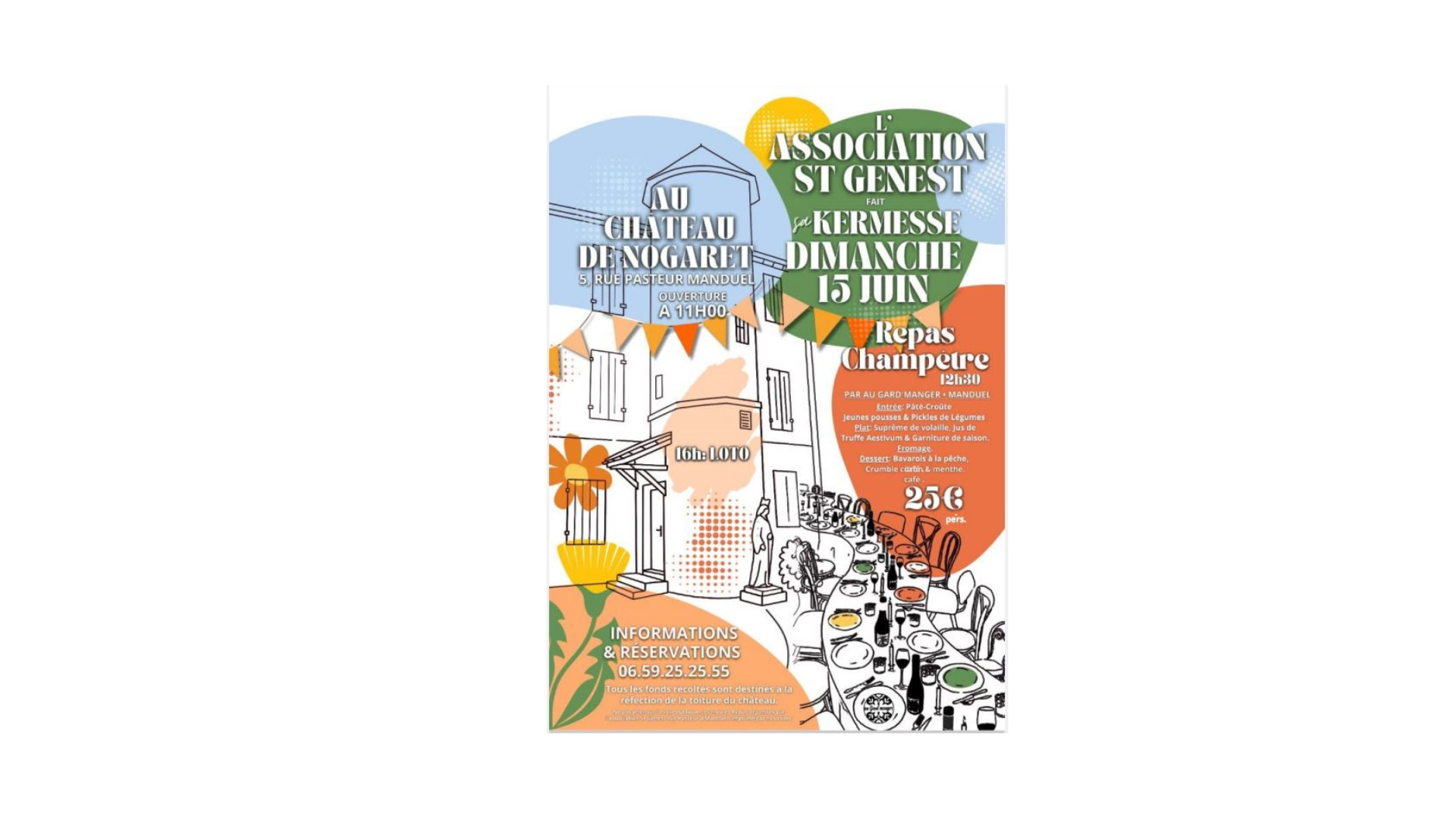 Retour aux événements kermesse association St Genest 15-06-2025Le 15/06/2025 + Ajouter au calendrierRécapitulatif Date et heureLe 15/06/2025Lieu 5 Rue Pasteur 30129 Manduel Pour afficher ce contenuvous devez accepter les cookies Publicitaires.Comment s'y rendre Partager Le lien à bien été copié