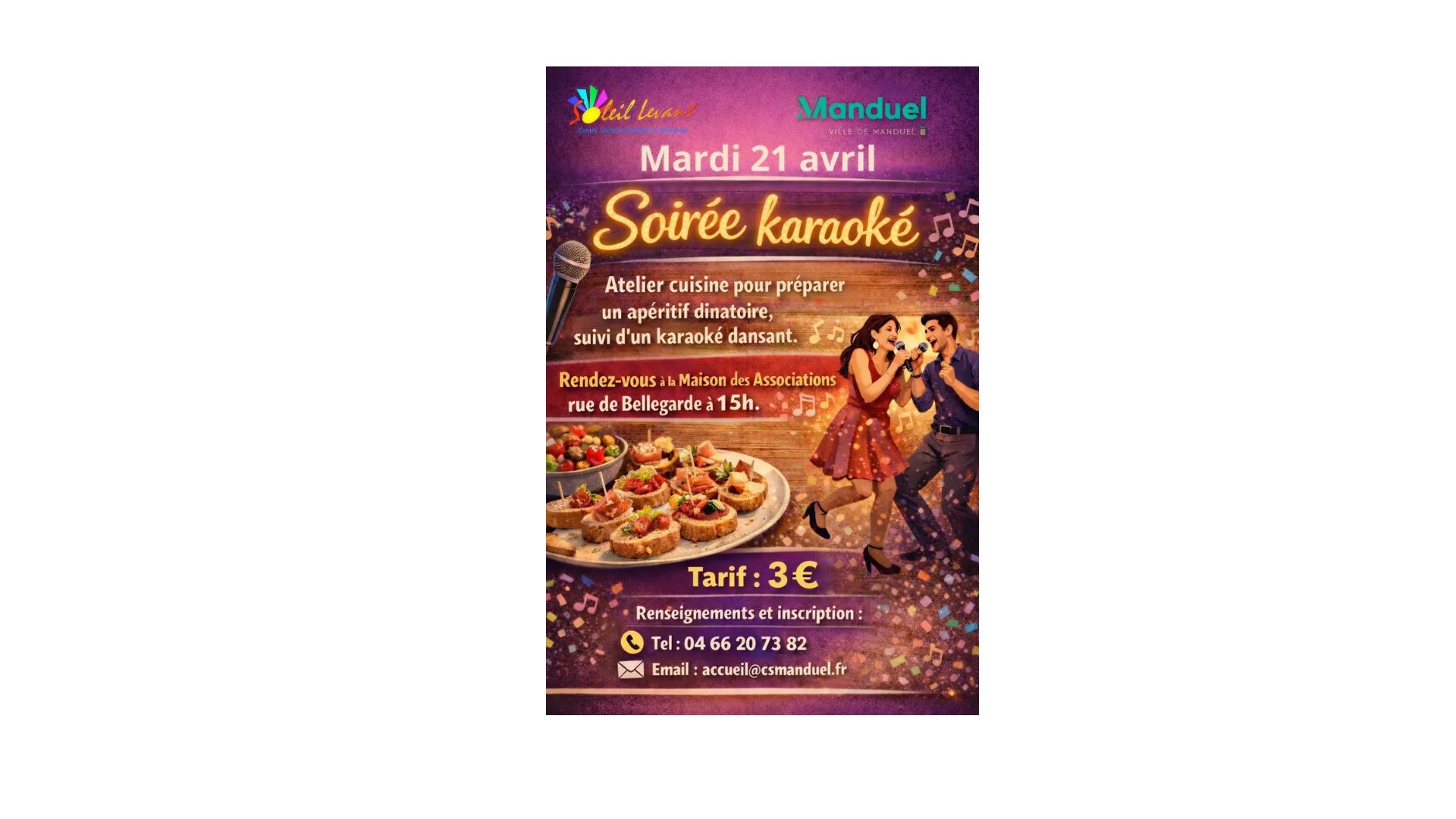 Evènements Retour aux événements Soirée karaoké – atelier cuisine – 21 avril 2026 Le 21/04/2026 + Ajouter au calendrier Récapitulatif Date et heure Le 21/04/2026 Partager Le lien à bien été copié