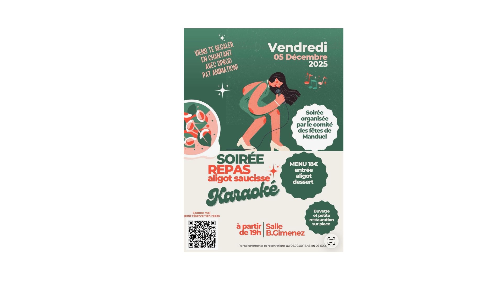 Evènements Retour aux événements Soirée repas aligot saucisse Le 05/12/2025 + Ajouter au calendrier Récapitulatif Date et heure Le 05/12/2025 Partager Le lien à bien été copié
