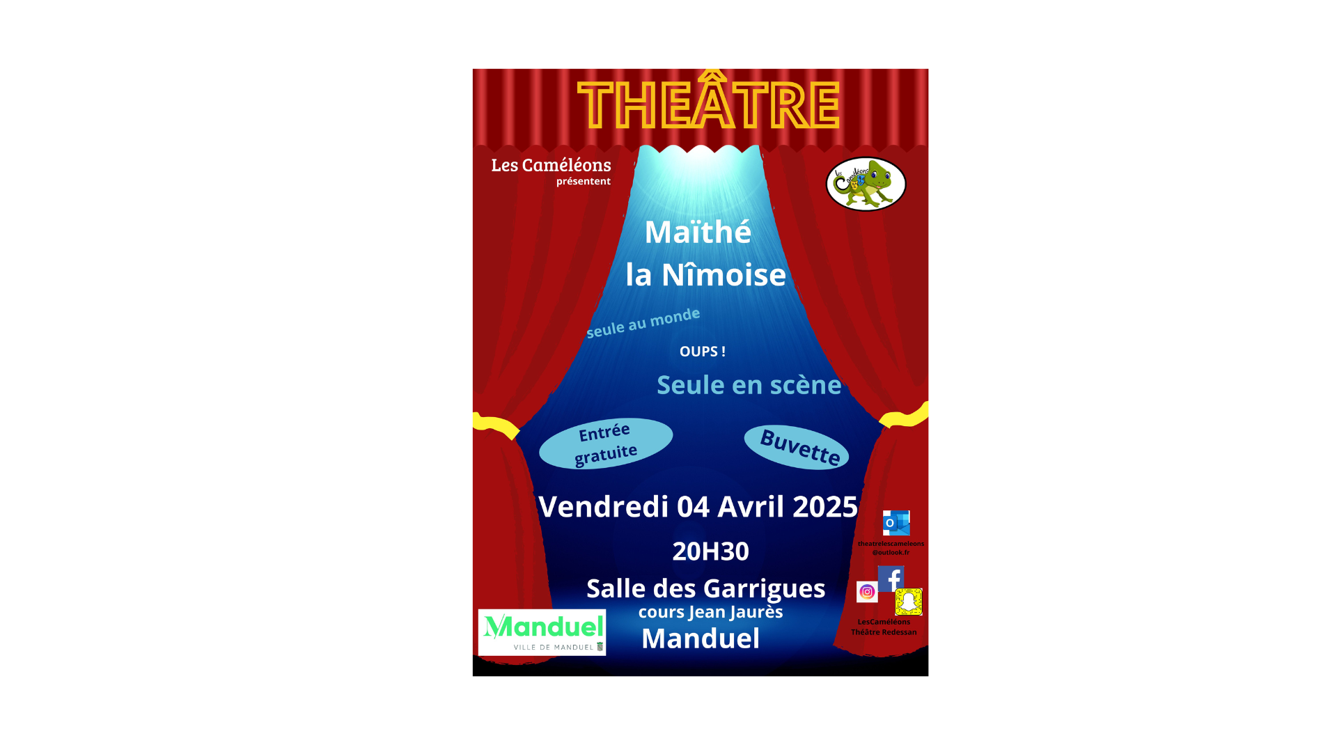 Retour aux événements Théâtre 04 avril 2025Le 04/04/2025 à partir de 20h30gratuit + Ajouter au calendrierRécapitulatif Date et heureLe 04/04/2025 à partir de 20h30Lieu Salle des Garrigues Cours Jean Jaurès 30129 ManduelTarifgratuit Pour afficher ce contenuvous devez accepter les cookies Publicitaires.Comment s'y rendre Partager Le lien à bien été copié