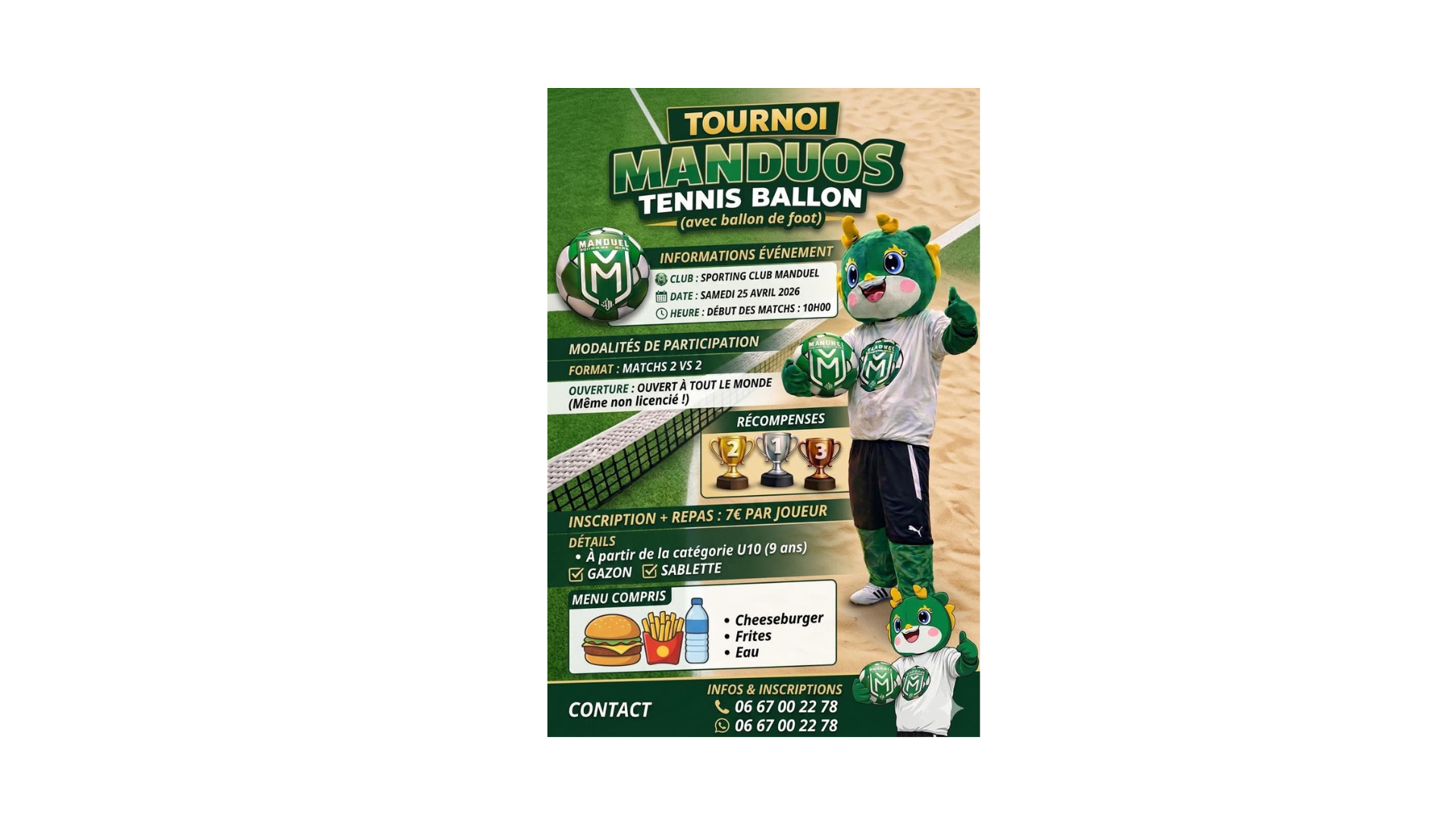 Evènements Retour aux événements Tournoi Manduos – Tennis ballon – 25 avril 2026 Le 25/04/2026 + Ajouter au calendrier Récapitulatif Date et heure Le 25/04/2026 Partager Le lien à bien été copié